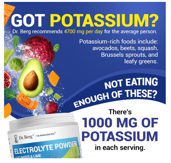 Dr. Berg Electrolyte Powder delivers a high-quality boost of essential electrolyte minerals, featuring an impressive 1000 mg of potassium per serving.