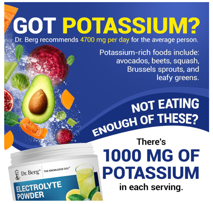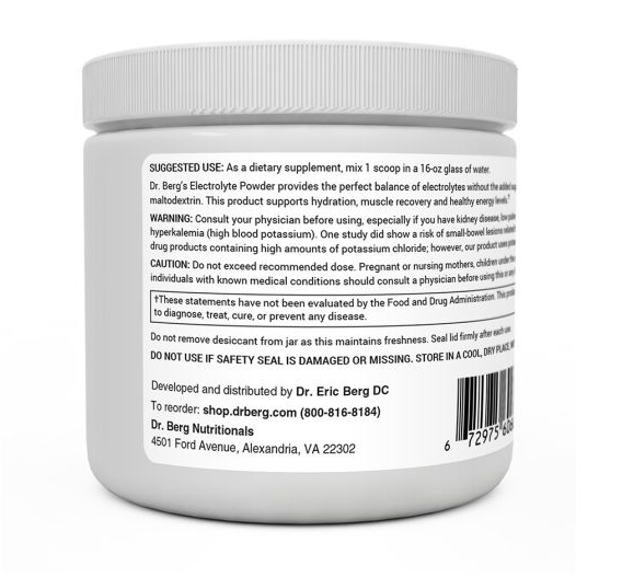 Dr. Berg Electrolyte Powder delivers a high-quality boost of essential electrolyte minerals, featuring an impressive 1000 mg of potassium per serving.