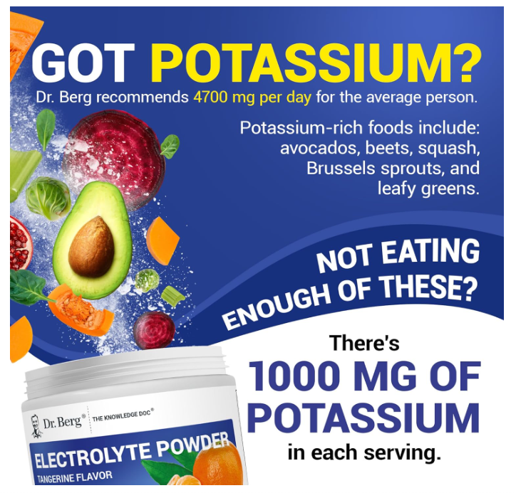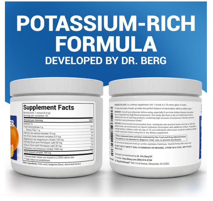 Dr. Berg Electrolyte Powder delivers a high-quality boost of essential electrolyte minerals, featuring an impressive 1000 mg of potassium per serving.