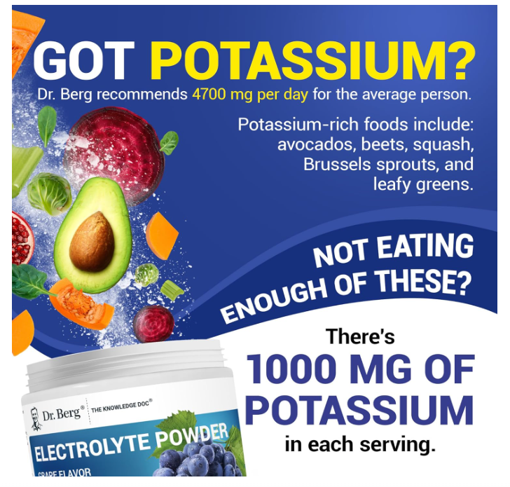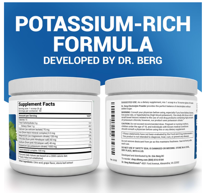 Dr. Berg Electrolyte Powder delivers a high-quality boost of essential electrolyte minerals, featuring an impressive 1000 mg of potassium per serving.