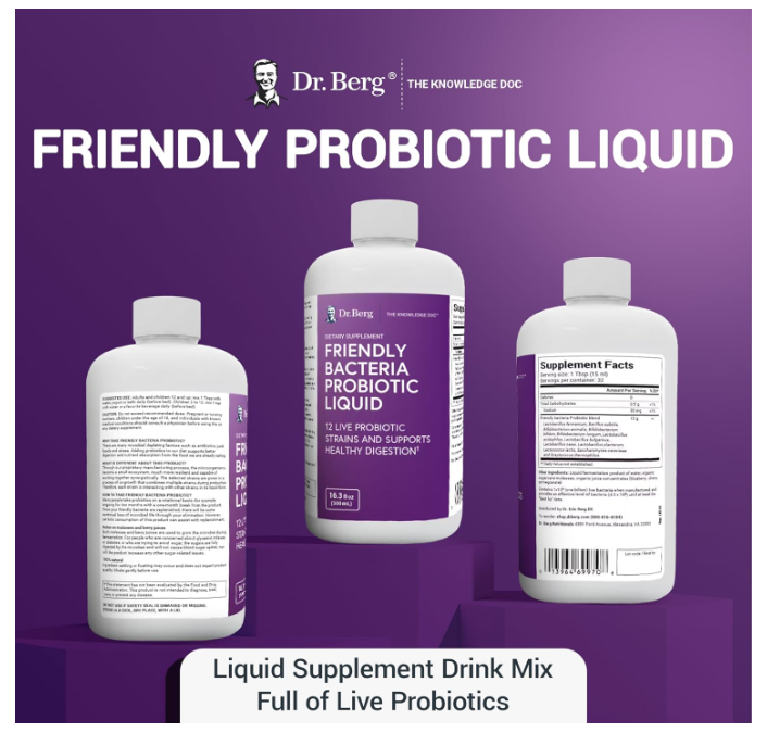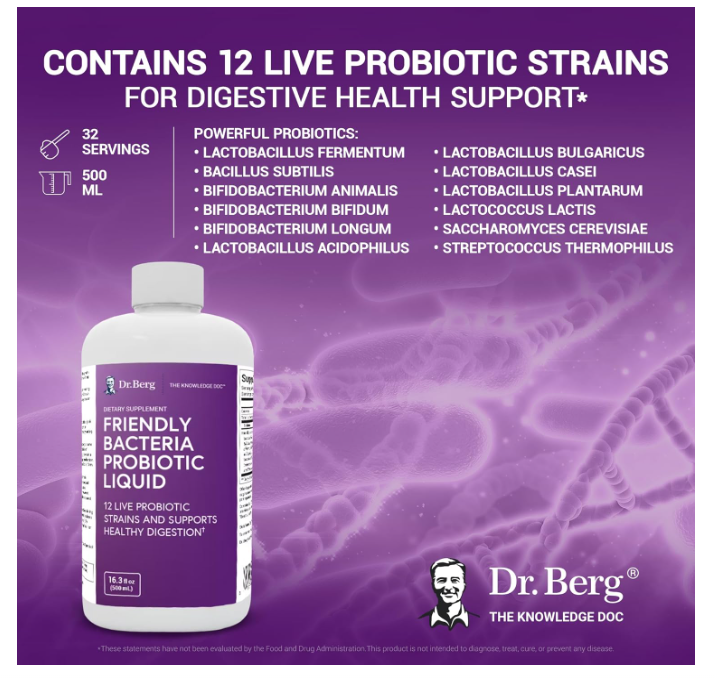 Dr. Berg Friendly Bacteria Probiotic Liquid is a powerful combination of premium ingredients that delivers a daily dose of twelve live probiotic strains.