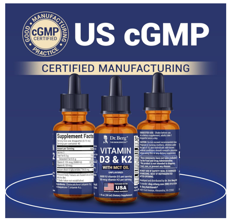 Dr. Berg Vitamin D3 & K2 with MCT Oil is manufactured in US-based cGMP-certified facilities, delivering a high-quality supplement you can trust.