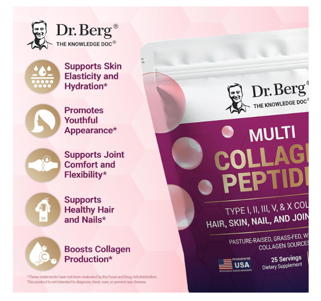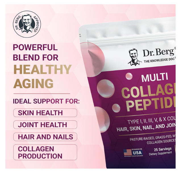 Dr. Berg Multi Collagen Peptides is a high-quality powder formula carefully designed to rejuvenate skin, strengthen joints, and promote healthy hair and nails.